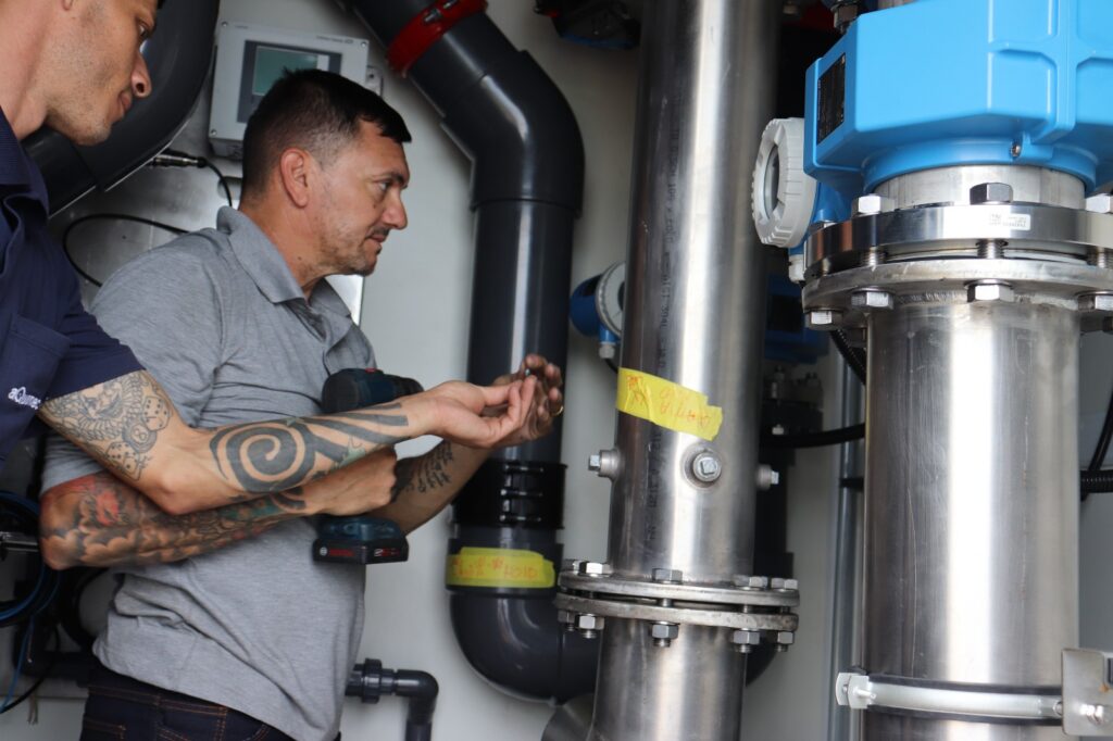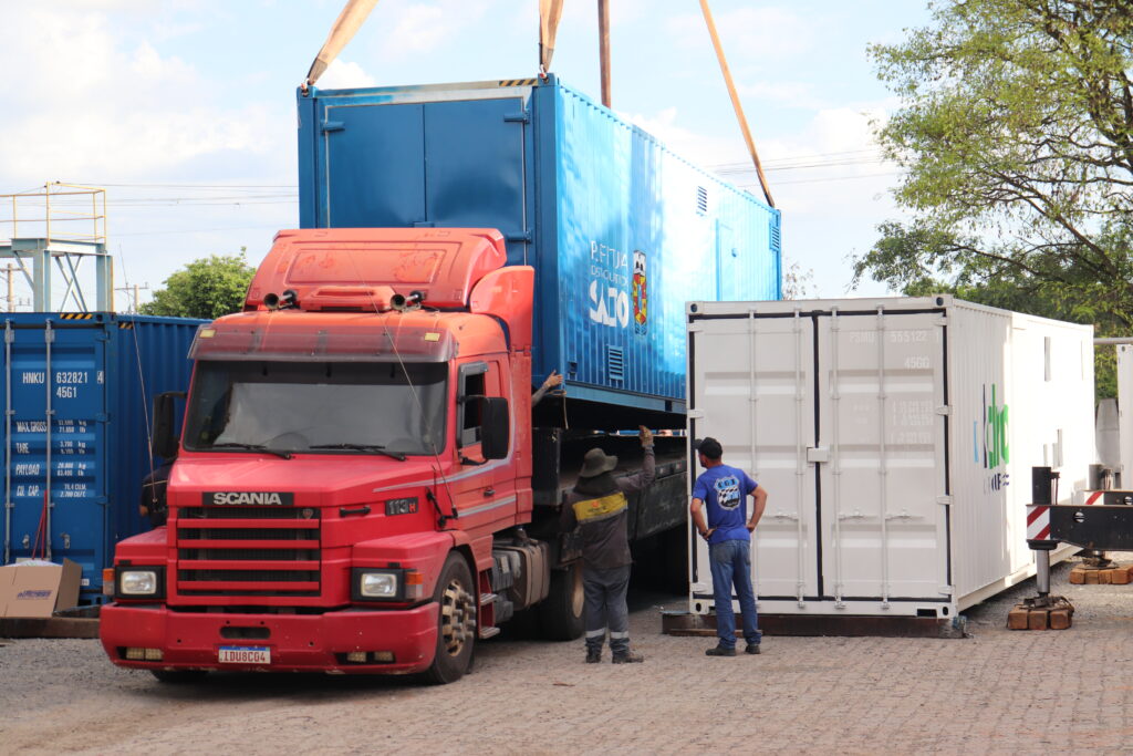 O moderno módulo com tecnologia de ultrafiltração foi trazido e instalado em uma das bases de concreto da ETA no último sábado, 8; desde então, trabalhadores do SAAE, terceirizados e da empresa fornecedora do equipamento trabalham para que a estação entre em operação o mais brevemente.